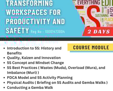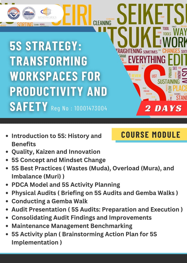 This course trains participants in the 5S methodology to create organized, efficient, and safe workplaces. It focuses on the five steps—Sort, Set in order, Shine, Standardize, and Sustain—to improve productivity, reduce waste, and support safety.